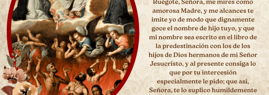 ¡Oh Virgen María, Madre de Dios y de los pecadores! Especial protectora de los que visten tu Sagrado Escapulario, te suplico por lo que Su Majestad te ha engrandecido escogiéndote para verdadera Madre suya, me alcances de tu querido Hijo Jesús el perdón de mis pecados, la enmienda de mi vida, la salvación de mi alma, el remedio de mis necesidades, el consuelo de mis aflicciones, y lo que en esta Novena especialmente te pido, si conviene para su mayor honra y gloria y bien de mi alma: que yo, Señora, para conseguirlo me valgo de tu intercesión poderosa, y quisiera tener el espíritu de todos los Ángeles, Santos y Justos para alabarte dignamente; y uniendo con sus afectos mis voces, te saludo una y mil veces diciendo: Ave María, gratia plena, etc…