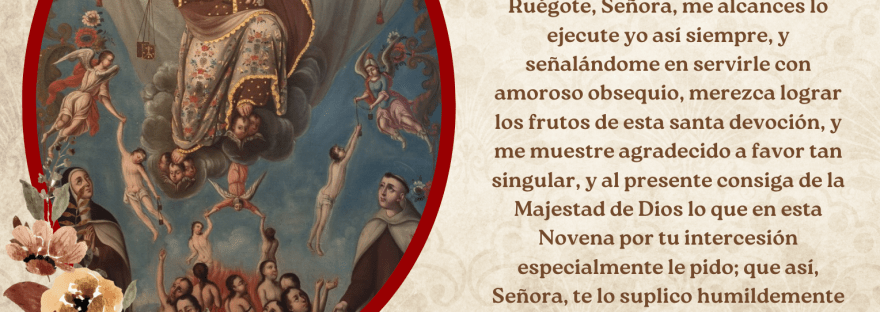 ¡Oh Virgen María, Madre de Dios y de los pecadores! Especial protectora de los que visten tu Sagrado Escapulario, te suplico por lo que Su Majestad te ha engrandecido escogiéndote para verdadera Madre suya, me alcances de tu querido Hijo Jesús el perdón de mis pecados, la enmienda de mi vida, la salvación de mi alma, el remedio de mis necesidades, el consuelo de mis aflicciones, y lo que en esta Novena especialmente te pido, si conviene para su mayor honra y gloria y bien de mi alma: que yo, Señora, para conseguirlo me valgo de tu intercesión poderosa, y quisiera tener el espíritu de todos los Ángeles, Santos y Justos para alabarte dignamente; y uniendo con sus afectos mis voces, te saludo una y mil veces diciendo: Ave María, gratia plena, etc…