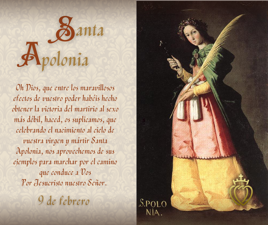 Oración: Oh Dios, que entre los maravillosos efectos de vuestro poder habéis hecho obtener la victoria del martirio al sexo más débil, haced, os suplicamos, que celebrando el nacimiento al cielo de vuestra virgen y mártir Santa Apolonia, nos aprovechemos de sus ejemplos para marchar por el camino que conduce a Vos. Por Jesucristo Nuestro Señor. Amén.